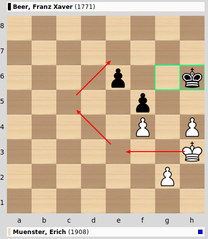 Hier entschloss sich Weiß unerkläerlicherweise zu 58.g4??. Nach dem Tausch und dem Tausch von e- und f- Bauer verbleibt nur der h-Bauer, der immer Remis ist. Stattdessen hätte der weiße König die lange rote Route nehmen sollen (nach der h-Bauer mit g3 gedeckt ist). Der schwarze König könnte dann seine Bauern wegen des h-Freibauern nicht verteidigen.