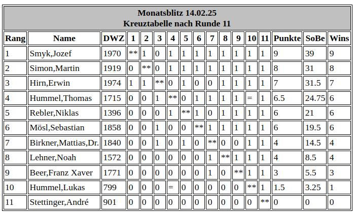 Das nächste Turnier ist das Monatsblitz-Turnier am Freitag, 14.02.2025 20:30 Uhr!