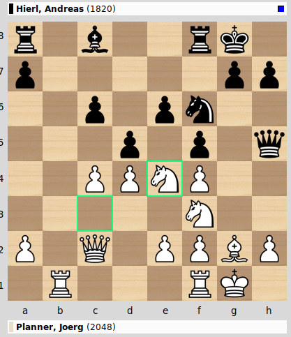 Nach 2:30 Stunden musste unser Andi Hierl an Brett 1 die Waffen strecken, nachdem er frühzeitig einen nicht offensichtlichen Fehler begangen hatte, der dem Gegner einen starken Freibauern auf der c-Linie einbrachte.