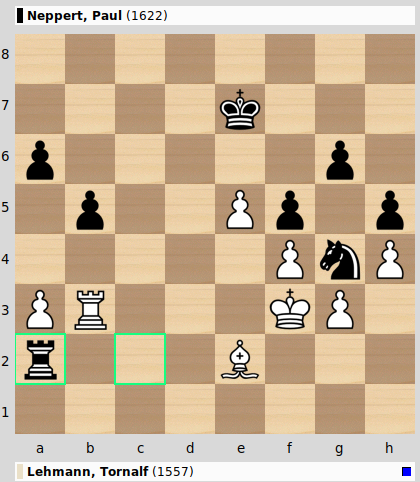 Eigentlich sollte die Stellung halten mit 38.Tc3 oder Td3. Aber anstatt aktiv zu spielen, erlaube Weiß Paul die Bildung eines Freibauern, der den Sieg einbrachte. Man beachte, dass in der abgebildeten Stellung der weiße Läufer nicht ziehen kann wegen Tf2 Matt.