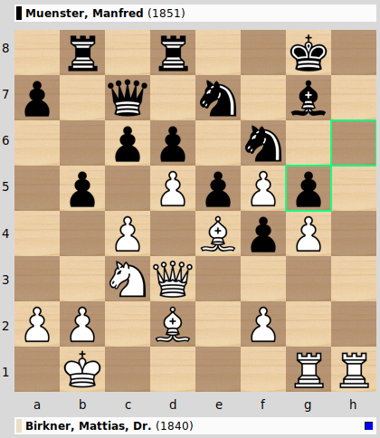 Die unrühmliche Rolle des Züngleins an der Waage blieb leider an mir hängen (Brett 4). Nachdem mein Gegner die eigene Königsstellung durch kühne Bauernvorstöße gelockert hatte, und bei heterogenen Rochaden hätte es nur noch eines „sprühenden Funkens“ in die „gludernde Lot“ bedurft, um ein Inferno heraufzubeschwören.