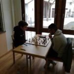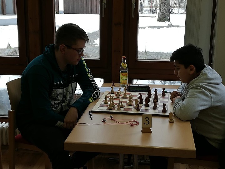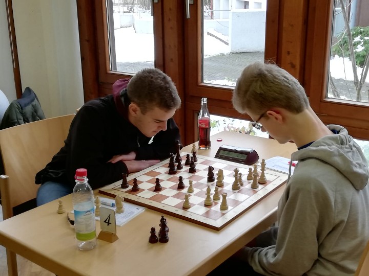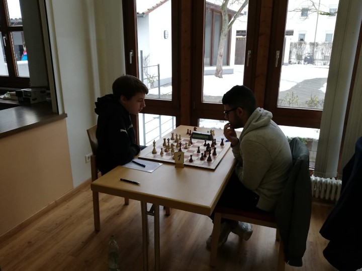 Der Wettkampf begann verheißungsvoll, hatte doch Timon Götz im Mittelspiel das Kommando übernommen und alsbald einen Bauern erobert. Unter Ausnutzung einer Fesselung kam ein Zweiter hinzu, wonach sein Freibauer nur unter Figurenopfer zu stoppen war. Der kurzfristig eingesprungene Ersatzmann Max Herrmann brachte mit heterogenen Rochaden Schwung in seine Partie, versäumte es aber seinen Angriff am Königsflügel konsequent fortzusetzen. So war eine ausgeglichene Stellung entstanden, bis Max ein verhängnisvolles Schach gab und somit seinem Gegenüber einen Doppelangriff auflegte. Johannes Hierl hatte einen kritischen Moment in der Eröffnung zu überstehen, danach entspann sich ein ausgeglichener Kampf bis es taktisch wurde: mit einer Springergabel eroberte Johannes eine Qualität, allerdings hätte er diese dank eines Konters sofort zurückgeben müssen. Dieser wurde aber vom Gegner übersehen, stattdessen setzte er alles auf eine Karte und nachdem Johannes alle Drohungen pariert hatte, durfte er einen Turm mehr sein Eigen nennen. Derweil gab es in der Partie von Paul Neppert ein wildes Gemetzel, was angesichts des in der Mitte verbliebenen gegnerischen Königs nur zu begrüßen war. Paul bekam drei Bauern für seine geopferte Figur und beste Angriffschancen, so dass man dem schwarzen Monarchen keine rosige Zukunft prognostizieren konnte. Mit wenig Zeit auf der Uhr fand Paul nicht die besten Züge, der Kontrahent setzte zum Gegenschlag an und die Stellung wogte einige Zeit hin und her bis letztlich Paul die Waffen strecken mmusste. Danach spielte sich beim Stand von 2:2 am Spitzenbrett ein wahres Drama ab. Lorenz Schilay und sein Dauerkonkurrent Joseph Homi befanden sich nach etwas mehr als 20 Zügen in Zeitnot. Hier hätte Lorenz eine Figur gewinnen können, übersah diese Möglichkeit aber und stand nur etwas besser. Daher lehnte er ein Remisgebot ab, lief aber kurz darauf in eine Springergabel und war fortan mit einer Quali weniger chancenlos. Eva Schilay kam gut aus der Eröffnung, nach einem fragwürdigen Springerzug hätte ihr Gegenüber aber die Möglichkeit gehabt leicht in Vorteil zu kommen. Danach übernahm Eva die Initiative, griff an und konnte dank zweier Freibauern in Kombination mit aktiven Figuren den Sieg einfahren.