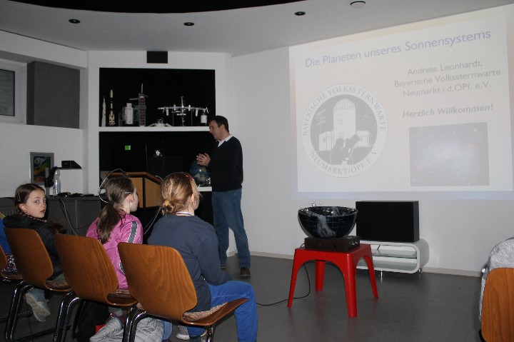 Anschließend ging es zur Sternwarte Neumarkt, wo uns der 1.Vorsitzende Andreas Leonhardt erwartete, der schon 2012 den Teilnehmern der 1.Offenen Mittelfränkischen U8 EM viel interessantes über den Jupiter erzählt hatte. Diesmal ging es in erster Linie über unser Sonnensystem, wobei er es den Kindern selbst überließ Fragen zu dem zu stellen was sie am meisten interessierte. Und da sprudelten die Fragen nur so heraus und Andreas nahm sich viel Zeit die Gefräßigkeit von Schwarzen Löchern zu erläutern und Gedankenansätze zu diskutieren, inwieweit die Marsroboter denn das vorhandene Gestein zum Schutz vor Staubstürmen nutzen könnten. Viele Bilder, Animationen sowie ein Modell zur Demonstration der Planetenbewegungen in unserem Sonnensystem veranschaulichten seine Informartionen. Im Anschluss ging es noch hoch in die Kuppel und jeder durfte einen Blick durch das Teleskop auf den Mond werfen, der dank der lückenhaften Wolken zu sehen war.
