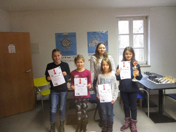 Immerhin ein Fünferfeld gab es in der U16, wobei das Los Maria gleich in der ersten Runde das Duell mit der topgesetzten Lisa Adelhardt (SC Erlangen 48/88) bescherte, mit der sie vor zwei Wochen noch Seite an Seite bei der DVM für die Erlanger U20-Mädchenmannschaft gekämpft hatte. Im ausgeglichenen Mittelspiel unterlief Maria ein taktischer Überseher, der einen Bauern kostete. Allerdings hatte Maria im Endspiel noch gute Remischancen, bis sie nochmal eine heraufziehende Taktik nicht auf dem Radar hatte, wonach Figur und Partie verloren war. Nach einer längeren da spielfreien Mittagspause gewann Maria einen Bauern und später die Qualität. Am nächsten Tag hatte Maria ebenfalls einen Mehrbauern, aber der gegnerische Turm kam auf die Grundreihe. Um dem Dauerschach aus dem Weg zu geheh, gab Maria den Bauern zurück und tauschte die Türme. Das Endspiel mit Springer gegen Läufer war ausgeglichen, aber nachdem die Leichtfiguren vom Brett gekommen waren, konnte Maria das Bauernendspiel mit einer Umgehung gewinnen. In der letzten Runde kam Maria zu einem druckvollen Angriff gegen den in der Mitte verbliebenen König. Da Lisa alle Partien gewinnen konnte, wurde Maria zum dritten Mal Vize-Meisterin. Ihre Bilanz mit sechs Titeln und drei zweiten Plätzen ist sehenswert, aber kurioserweise wird sie immer Zweite wenn Lisa in ihrer Altersklasse mitspielt, da sie im direkten Vergleich jedes Mal den Kürzeren gezogen hat.