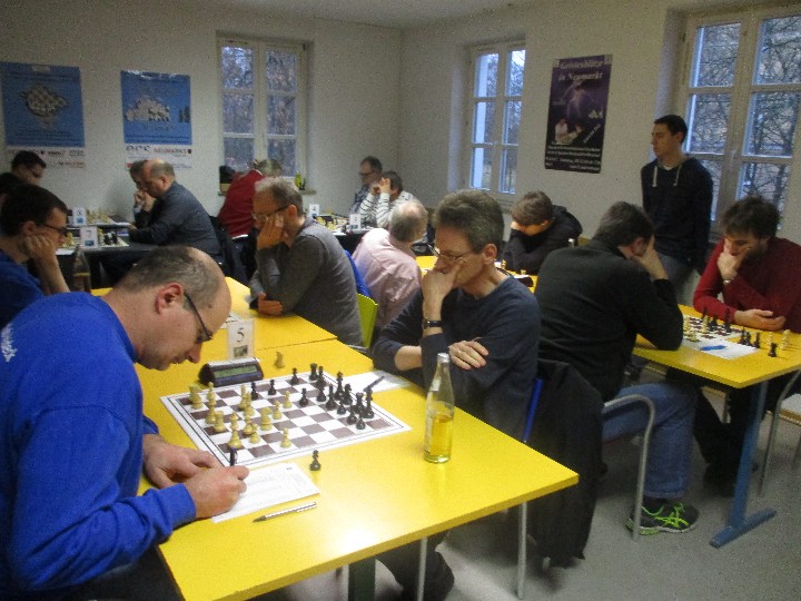 Nun musste an den beiden verbleibenden Partien an Brett 5 und 8 noch ein Remis her. Die erste Entscheidung fiel auf Brett 8, wo unser Manschaftsführer Wolfgang Brunner die weissen Steine gegen Lukas Rupprecht führte. Aus einem angenommenen Damengambit konnte Wofgang eine druckvolle Stellung mit dem Läuferpaar gegen Springer und Läufer aufbauen. Wolfgang lehnte ein Remisangebot seinens Gegners ab und versuchte weiter eine Druckstellung aufzubauen, was ihm auch sehr gut gelang. Nach längerem nachdenken zog er seinen d-bauern vor und hatte dabei übersehen, dass sein Gegner nach dem Abtauschen einer Figur auch mit dem Bauern zurücknehmen könnte, was ihm somit einen Bauern kostete. Wolfgang machte noch ein paar Züge und bot seinem Gegner dann Remis, was dieser auch sofort annahm. Sicher auch aufgrund seiner Zeit, die ihm noch verblieben war, somit war unser Manschaftssieg sicher gestellt. (4,5 – 2,5)