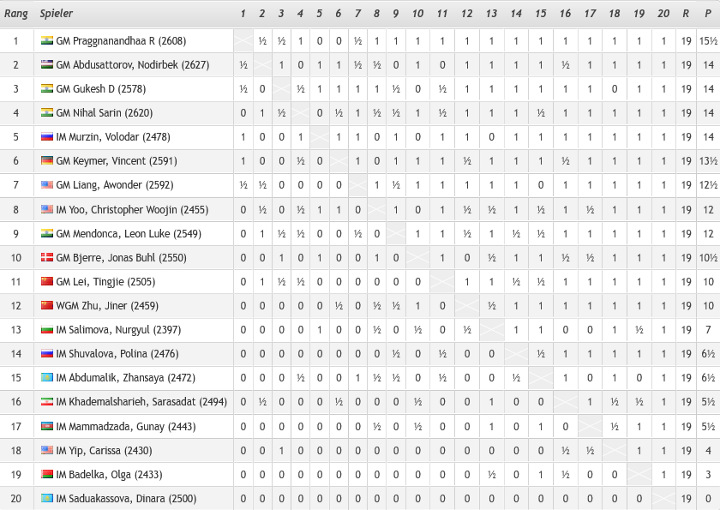 Bereits eine Runde vor Schluss stand der Turniersieg von einem der hoffnugsvollsten indischen Talente Praggnanandhaa fest. In dem starken Teilnehmerfeld hatte er am Ende 15,5/19 auf dem Konto und lag damit 1,5 Zähler vor einem Quartett bestehend aus dem Usbeken Abdusattorov, den Indern Gukesh und Sarin sowie dem Russen Murzin. Knapp dahinter ging mit 13,5 Punkten Vincet Keymer als Sechter durchs Ziel. Er hatte am ersten Tag 3,5/5 geholt und dabei nur gegen Gukesh verloren. Eine Doppelnull in den Runden acht und neun gegen Abdusattorov und Murzin warf ihn dann weiter zurück. Zum Auftakt von Turniertag drei hatte Keymer Nihal Sarin in den Seilen, konnte seinen Vorteil aber nicht konservieren. Danach spielte er sich mit sieben Siegen am Stück u.a. gegen den Turniersieger auf den geteilten zweiten Platz nach vorne. In der letzten Runde war Keymer drauf und dran mit einem weiteren Erfolg Zweiter zu werden, verlor die Partie aber noch.
