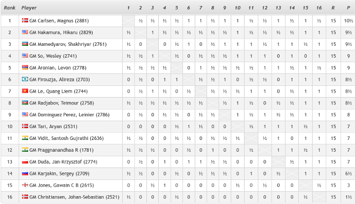 Auch bei der fünften Etappe der CCT heißt der Sieger der Vorrunde Magnus Carlsen. An allen drei Tagen holte er 3,5/5 und blieb dabei ungeschlagen. Sechs Siege und neun Unentschieden bedeuteten wie zuletzt beim Magnus Carlsen Invitational 10,5 Punkte. Allerdings nutzte Carlsen der souveräne Sieg in der Vorrunde bislang nichts, läuft er doch dem ersten Turniersieg bei der CCT noch hinterher. Auch Hikaru Nakamura blieb ungeschlagen und kam mit 9,5 Punkten auf Rang zwei vor dem punktgleichen Shakhriyar Mamedyarov, der mit den meisten Siegen (7) erstmals die KO-Phase erreicht hat. Ein zweites neues Gesicht in den Playoffs ist Quang Liem Le, der mit 8,5 Zählern Siebter wurde. Die weiteren Qualifizierten sind der zweifache Etappen-Sieger Wesley So (4./9 Punkte), der sich nach schwerem Start mit drei Niederlagen aus den ersten sechs Partien zurück nach vorne kämpfte, Levon Aronian (5./9 Punkte), Alireza Firouzja (6./ 8,5 Punkte) sowie Etappen-Sieger Teimour Radjabov (8./8,5 Punkte), der nach Tag eins mit 4/5 in Front gelegen hatte, aber in der letzten Runde noch ein Remis gegen Vidit Gujrathi zur Quali benötigte. Vidit war derweil lange auf Kurs sich erstmals für die KO-Phase zu qualifizieren, lag nach acht ungeschlagenen Partien mit 5 Punkten auf Platz vier. Aber der vergebene Sieg gegen seinen Landsmann Praggnanandhaa in Runde acht brachte ihn aus der Spur und nach vier Niederlagen in Folge waren die Quali-Plätze außer Reichweite. Nachwuchsstar Pragg zeigte bei seinem CCT-Debüt eine bärenstarke Leistung und spielte auch gegen die großen Namen forsch auf Sieg. Gleich zum Auftakt bezwang er Jan-Krzysztof Duda und gewann auch gegen „Verteidigungsminister“ Sergey Karjakin, da er in einer taktischen Variante einen Zug weiter gerechnet hatte. Damit lag er nach Tag eins mit 3/5 auf dem geteilten vierten Platz. Die Ausbeute an Tag zwei mit 1,5 Zählern – darunter ein Erfolg über Radjabov – war dann zu gering für eine gute Ausgangslage um sogar um die Playoffs mitspielen zu können. In den letzten drei Partien holte er jeweils ein Unentschieden gegen Carlsen, Nakamura und Firouzja, wobei er auch den Weltmeister unter Druck setzte. Mit sieben Punkten kam Pragg auf einen guten zwölften Platz. Zwei Ränge vor ihm wurde punktgleich Aryan Tari bester Debütant, Gawain Jones (3) und Johan-Sebastian Christiansen (1,5) beendeten ihre erste CCT-Teilnahme auf den Plätzen 15 und 16.