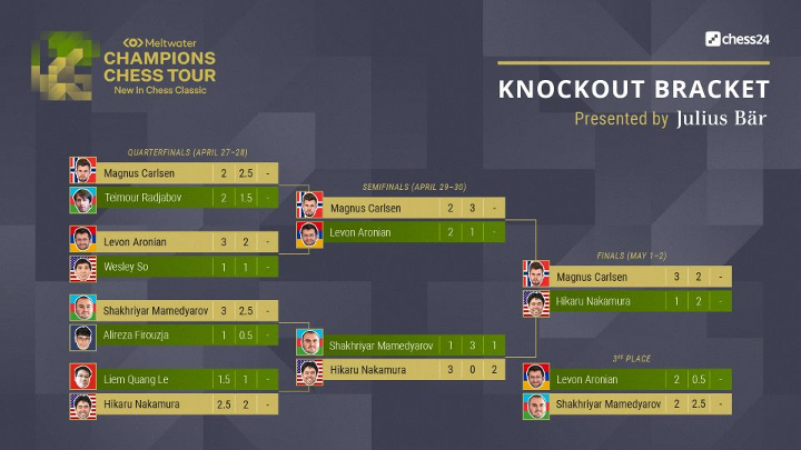 Hatta Nakamura an sechs Turniertagen von 26 Partien nur eine gegen Mamedyarov in derem ersten Match verloren, ging Match zwei unerwartet mit 0:3 verloren. Dabei war Nakamura in den ersten beiden Partien jeweils lange Zeit besser gestanden. Zum Auftakt griff er letztlich im Damenendspiel daneben, in der folgenden Partie büßte er eine Figur ein. In Partie Nummer drei musste Nakamura gewinnen, doch Mamedyarov hatte die Lage stets im Griff und erzwang einen Blitz-Tiebreak. Da beide Blitzpartien nie das Gleichgewicht verließen musste eine Armageddon-Partie die Entscheidung bringen, bei der Nakamura die schwarzen Steine wählte. Mamedyarov kam gut aus der Eröffnung, fand dann aber keinen guten Plan gegen Nakamuras Aufbau. Er verbrauchte seinen Zeitvorsprung, verlor einen Bauern und Nakamura machte die Türe nicht mehr auf.