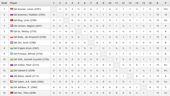Levon Aronian heißt der Sieger der Vorrunde mit starken 10,5/15. Nachdem er im letzten Turnier mit 8 Punkten als Neunter ausgeschieden war, blieb er diesmal ungeschlagen und sicherte sich früh die Qualifikation für die KO-Phase. Rang zwei mit 10 Zählern sicherte sich Debütant Artemiev, der aber insbesondere bei kurzen Bedenkzeiten regelmäßig bei den Online-Turnieren vorne mitmischt. Dritter mit 9,5 Zählern wurde Ding Liren, der dank des früheren Beginns diesmal nicht bis weit nach Mitternacht spielen muss. Magnus Carlsen durfte in der letzten Runde gegen Vidit nicht verlieren, sonst wäre er bei einem Sechservergleich mit je 8 Punkten ausgeschieden. So lagen vier Spieler gleichauf mit dem schlechteren Ende für Firouzja auf Rang neun, da Jan-Krzysztof in der letzten Partie gegen Gukesh eine zunächst gewonnene, dann aber verlorene Stellung doch noch siegreich zu Ende brachte. Für Gukesh wurde es Rang zwölf mit 6,5 Zählern, dafür gelang mit Arjun Erigaisi einem anderen der zahlreichen jungen GMs aus Indien die Quali.