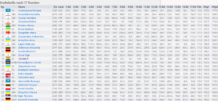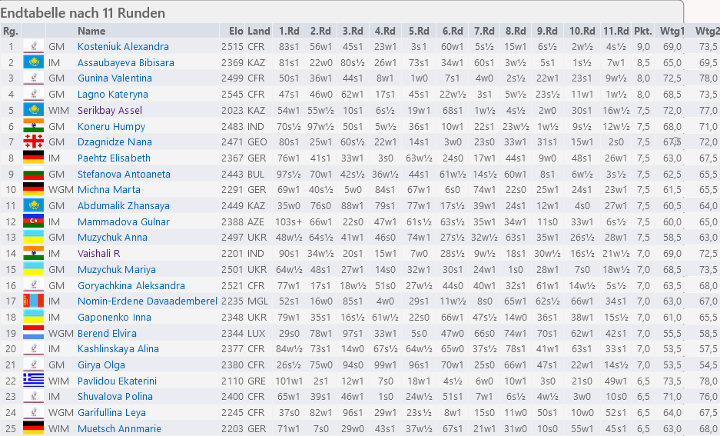 Nach dem Verlust des Schnellschach-Titels hatte Magnus Carlsen im ersten Teil der Blitz-WM nicht seinen besten Tag, musste drei Niederlagen hinnehmen und liegt mit 8,5/12 auf Rang acht. Spitzenreiter ist Levon Aronian mit 10 Punkten, vor Bassem Amin mit 9,5 und Parham Maghsoodloo mit 9. Dahinter lauern zwölf Spieler mit 8,5 Zählern, darunter u.a. Nepo, der dreifache Blitz-Weltmeister Alexander Grischuk, Daniil Dubov, Hikaru Nakamura und Anish Giri. Rasmus Svane war einer von drei Spielern, die mit 4/4 ins Turnier starteten, ehe er Grischuk unterlag. Nach einem Remis in Runde acht gegen Nepo, bezwang Svane nacheinander die #3 Vladislav Artemiev und die #5 Fabiano Caruana, wonach er mit erstklassigen 7,5/10 auf Rang sechs lag. Zwei Niederlagen zum Abschluss des ersten Tages bedeuten aktuell Platz 26. Alexander Donchenko und Daniel Fridman liegen mit 6,5 Punkten auf den Rängen 63 und 75. Bei den Damen führt Bibisara Assaubayeva mit 8/9 alleine die Tabelle an, einen halebn Zähler dahinter liegt Vaishali Rameshbabu, die große Schwester von Praggnanandhaa. Es folgen Humpy Koneru, Alexandra Kosteniuk sowie Zhansaya Abdumalik mit je 7 Punkten. Elisabeth Pähtz belegt mit 6 Zählern Platz 19, Annmarie Mütsch und Marta Michna mit je 5 Punkten die Ränge 39 und 43.