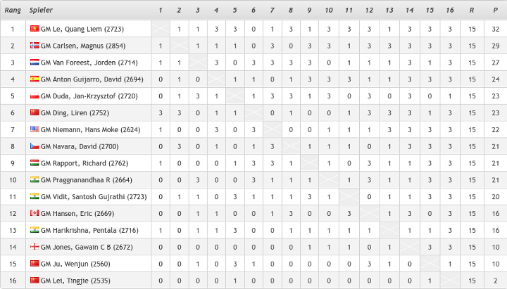 Quang Liem Le zeigte eine beeindruckende Leistung in der Vorrunde und gewann diese mit stolzen 32 Punkten. Erst in Runde 12 kassierte er seine einzige Niederlage gegen Ding Liren, gewann neun Partien und spielte fünfmal remis. Einzig Magnus Carlsen konnte Schritt halten und beendete die Vorrunde mit 29 Zählern als Zweiter. Dahinter wechselte die Reihenfolge munter durch. Spieler hatten starke und schwache Tage, bei denen es schnell um viele Plätze hochging, nur um Tags darauf aus den Top-Acht rauszufallen. Die Qualifikation war spannend bis zuletzt, mit Richard Rapport, Pragg und Vidit auf den Rängen neun bis elf als diejenigen, die die KO-Phase knapp verpasst haben.
