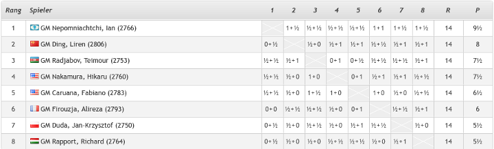 Von den 28 Partien der Hinrunde fanden acht einen Sieger: viermal gewann Nepo, dreimal Caruana und einmal Nakamura. Damit liegt der Sieger des Kandidatenturniers 2020/21 Nepo mit beeindruckenden 5,5/7 an der Spitze und einzig der Sieger des Kandidatenturniers von 2018 Caruana mit nicht minder starken 5/7 ist noch in Reichweite. Denn Nakamura hat mit 3,5 Zählern schon zwei Punkte Rückstand, der Rest hat weniger als 50%, darunter auch die hochgehandelten Ding und Firouzja.