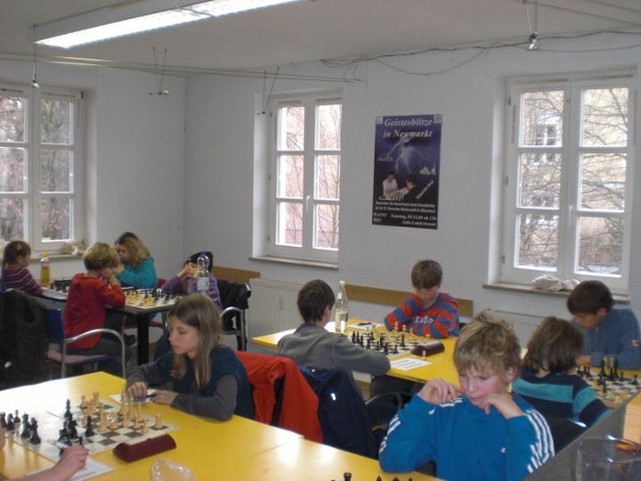 Durch das 2:2 blieb uns immerhin das Topteam von Nürnberg Süd in der zweiten Runde erspart und wir trafen auf Noris Tarrasch. Allerdings mussten wir nun auf Simon und Eva verzichten, die von Johannes Hierl und Maria Schilay ersetzt wurden. Auch in dieser Aufstellung bestand durchaus die Hoffnung gegen die Tarrascher was zu holen. Und eigentlich begann es auch gut, hatte Johannes doch nach wenigen Zügen eine Gewinnstellung auf dem Brett. Aber nach einem einzügigen Dameneinsteller war er chancenlos. Maria erlaubte ihrer Gegnerin ein Springeropfer auf f7, doch da diese in der Folge nicht konsequent genug weiterspielte bekam Maria mehrfach die Chance sich zu konsolidieren. Allerdings kennt Maria nur eine Devise und die lautet Angriff. Entsprechend verspeiste sie einen Turm und ließ ihren König im Feuer der gegnerischen Figuren. Als eine letzte Chance den König doch noch in Sicherheit zu bringen ungenutzt blieb und dieser mittlerweile auf b4 auftauchte, war das Matt nicht mehr zu verhindern. Timon kam gut aus der Eröffnung, tauschte dann aber viel ab. Dennoch war urplötzlich eine taktische Möglichkeit auf dem Brett, die ihm einen Damengewinn beschert hätte. Später war die Stellung ausgeglichen, bis Timon seine Figuren derart unglücklich postierte, so dass ein Turmverlust nicht mehr zu verhindern war. Dass Lorenz nicht seinen besten Tag erwischt hatte, zeigte zunächst auch die zweite Partie. Nachdem er einen frühen Bauerngewinn ausgelassen hatte, verschenkte er einige Tempi und büßte zwei Bauern ein. Doch Lorenz kämpfte sich zurück in die Partie, glich materialmäßig aus und stand im Endspiel sogar leicht aktiver. Der Gegner ließ aber nichts mehr zu, so dass auch ein vorübergehender Mehrbauer nichts brachte, da am Ende nur die Könige übrigblieben. Insgesamt hätte es ruhig ein Mannschaftspunkt mehr sein dürfen, mal sehen was in der letzten Doppelrunde noch zu holen ist.