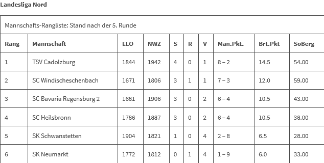 Auch andere Schachvereine hatten offenbar Schwierigkeiten, ihre Mannschaften zu füllen, denn insgesamt waren nur 6 Mannschaften vor Ort: SK Schwanstetten, SV Cadolzburg, SC Heilsbronn, SC Bavaria Regensburg, SC Windischeschenbach, SK Neumarkt. Es wurde deshalb entschieden, ein 5-rundiges Rundenturnier zu spielen (jeder gegen jeden). Der zweite Schock kam, als wir unsere trockenen Kehlen am Getränketisch laben wollten, das Hotel jedoch königliche 5€ für eine Flasche Mineralwasser verlangte! Der Frage, ob das Wasser aus der Ukraine importiert wurde oder unter immensem Energiebedarf gefördert wird, konnten wir nicht mehr nachgehen.
