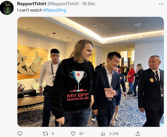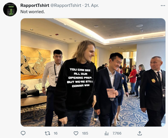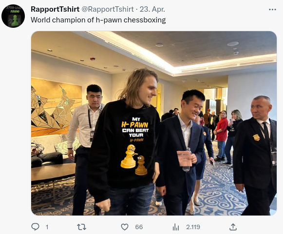 Legendenstatus hat jetzt schon die „Bromance“ zwischen Ding und seinem offenbar einzigen Sekundanten von Rang, dem ungarischen Spitzen-Großmeister Richard Rapport, der Ding nicht nur schachlichen sondern offenbar auch psychologischen Beistand bot. Immerhin lag Ding im gesamten Wettkampf drei Mal in Rückstand und kämpfte sich mit präzisen Zügen und manchmal ein bisschen Glück („der gute Spieler hat immer Glück!“, J.R. Capablanca) zurück ins Match. Das einzige Mal als er in Führung ging – zum 2,5:1,5 im Tiebreak – war er prompt Weltmeister.