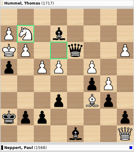 Noch dramatischer ging es in der Begegnung zwischen Thomas Hummel und Paul Neppert zu. Paul kam gut aus der Eröffnung und konnte bald ein prächtiges Läuferpaar den Stolz seiner Stellung nennen. Als dann Thomas auf Bauernjagd seine Dame in den hintersten Winkel des Brettes (a6 und a8) beorderte, zogen allmählich schwarze Gewitterwolken um Thomas König auf. Nach der fatalen Öffnung der eigenen Königsstellung wurde es auf einmal eng für Thomas König und er durfte sich von nun an keinen Fehltritt mehr erlauben.