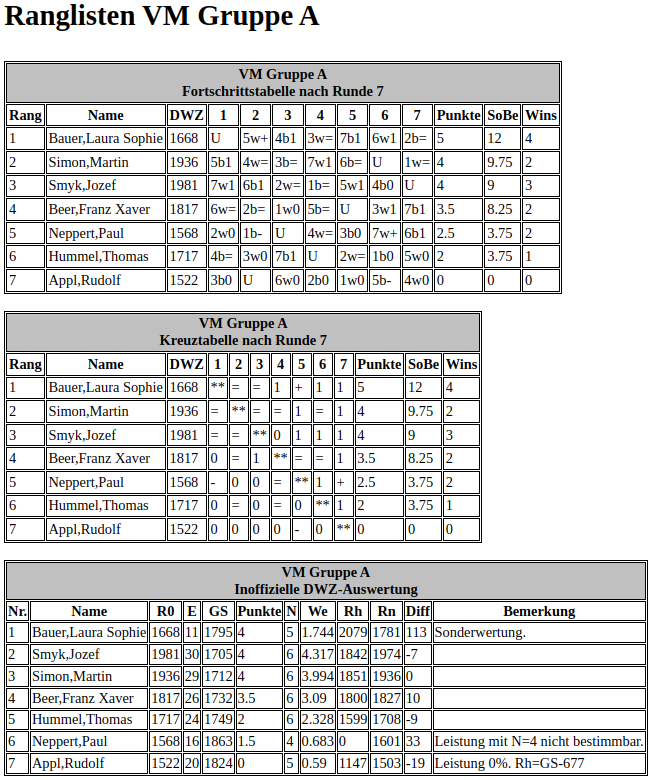 Gestern Abend fanden die letzten Begegnungen der diesjährigen VM statt, die mit der Vergabe der Podestplätze zwar nichts mehr zu tun hatten, aber trotzdem noch heiß umkämpft waren. In Gruppe A kam Rudi Appl als Weißer gegen F. X. Beer bequem aus der Eröffnung, ließ dann aber zu, dass F. X. seine Königsstellung aufriss. Die Möglichkeit zu Figurengewinn und Matt ließ sich der alte Taktik-F(u)X dann natürlich nicht mehr nehmen.