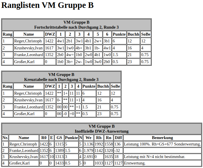 Im B-Turnier trennten sich Leonhard Franke und Karl Großer in einem verrückten Spiel der Irrungen und Wirrungen schließlich Remis. Am Durchmarsch von Christoph Reger, der sich mal wieder als Klasse für sich erwies, änderte das natürlich nichts. Auch hier herzliche Gratulation an den Sieger und alle Teilnehmer. Zwar ist es schon „Tradition“, dass im B-Turnier mehr kampflose Partien nicht stattfinden, aber mit 2 aus 12 ist es im Rahmen geblieben.