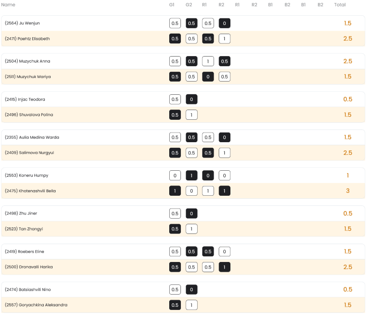 Dagegen gewann Elisabeth Pähtz nach einem Remis zum Auftakt die zweite 25+10-Partie und steht damit erstmals im Viertelfinale. Ausgeschieden sind Humpy Koneru, Wesley So, Peter Svidler und Hikaru Nakamura, der gegen Praggnanandhaa mit 1:3 den Kürzeren zog.