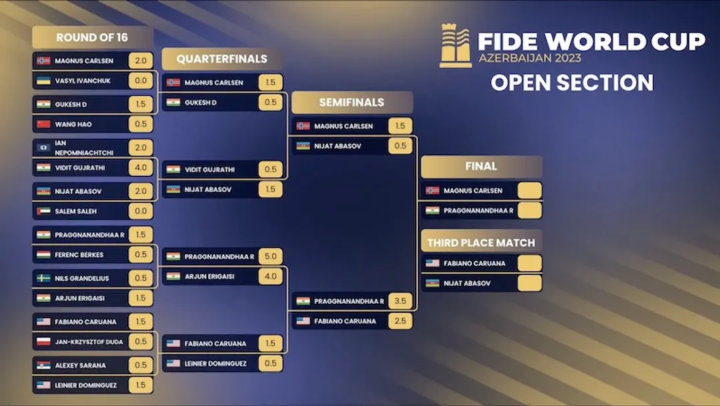 Nachdem er sich eine Lebensmittelvergiftung eingefangen hatte, ging Magnus Carlsen angeschlagen in sein erstes Weltcup-Finale. Mit Schwarz gelang es ihm jegliche weiße Initiative zu neutralisieren und tags darauf wählte er eine zahnlose Variante, die in einer schnellen Punketeilung mündete. Im Tie-Break griff Praggnanandhaa mit Weiß zunächst an, doch Carlsen gelang es nicht nur den Angriff zu stoppen, sondern im Endspiel seine große Stärke in die Waagschale zu werfen: sukzessive seine Figuren minimal zu verbessern, bis die gegenerische Verteidigungsaufgabe mit wenig Bedenkzeit zu schwierig wird. Danach führte Carlsen die folgenden Partie schnell in ruhige Gewässer und holte damit nun auch den letzten fehlenden wichtigen Titel in seiner Karriere. Im Match um Platz drei legte Nijat Abasov vor, nachdem Fabiano Caruana ein grober Überseher unterlaufen war und er dem folgenden Mattangriff nichts mehr entgegenzusetzen hatte. Doch Caruana schlug zurück, erzwang den Tie-Break und gewann dort beide Schnellschachpartien.