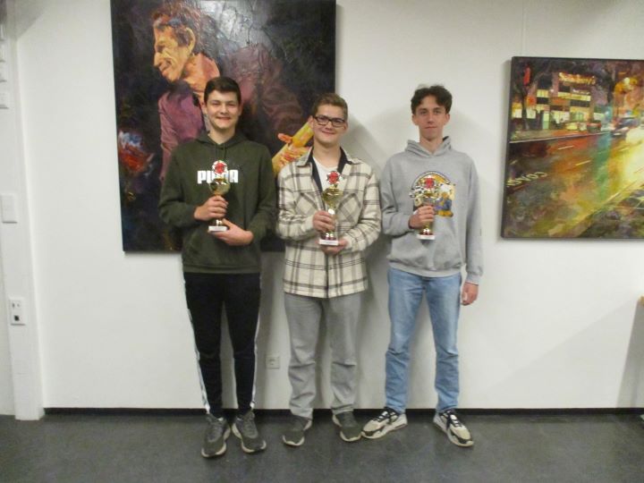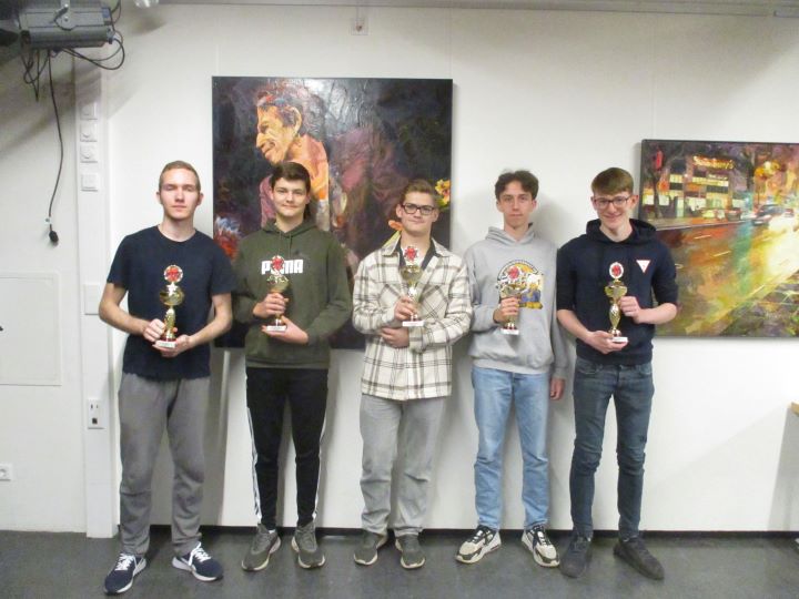 In der Endabrechung waren Leonhard und Andreas als Gesamtfünfter und -sechster nun punktgleich, aber dank 16,0 zu 15,5 Buchholzpunkten ging der U16-Titel an Leonhard. Turniersieger und U18-Meister wurde Marco mit starken 5/5, dahinter waren Andrii Stopochkin (SC Noris Tarrasch Nürnberg) und Christoph mit je 3,5 Zählern auch Buchholz- und SoBe-gleich, so dass die Siegwertung den Ausschlag geben musste und hier hatte Christoph einen weniger auf dem Konto und musste mit Rang drei vorlieb nehmen.