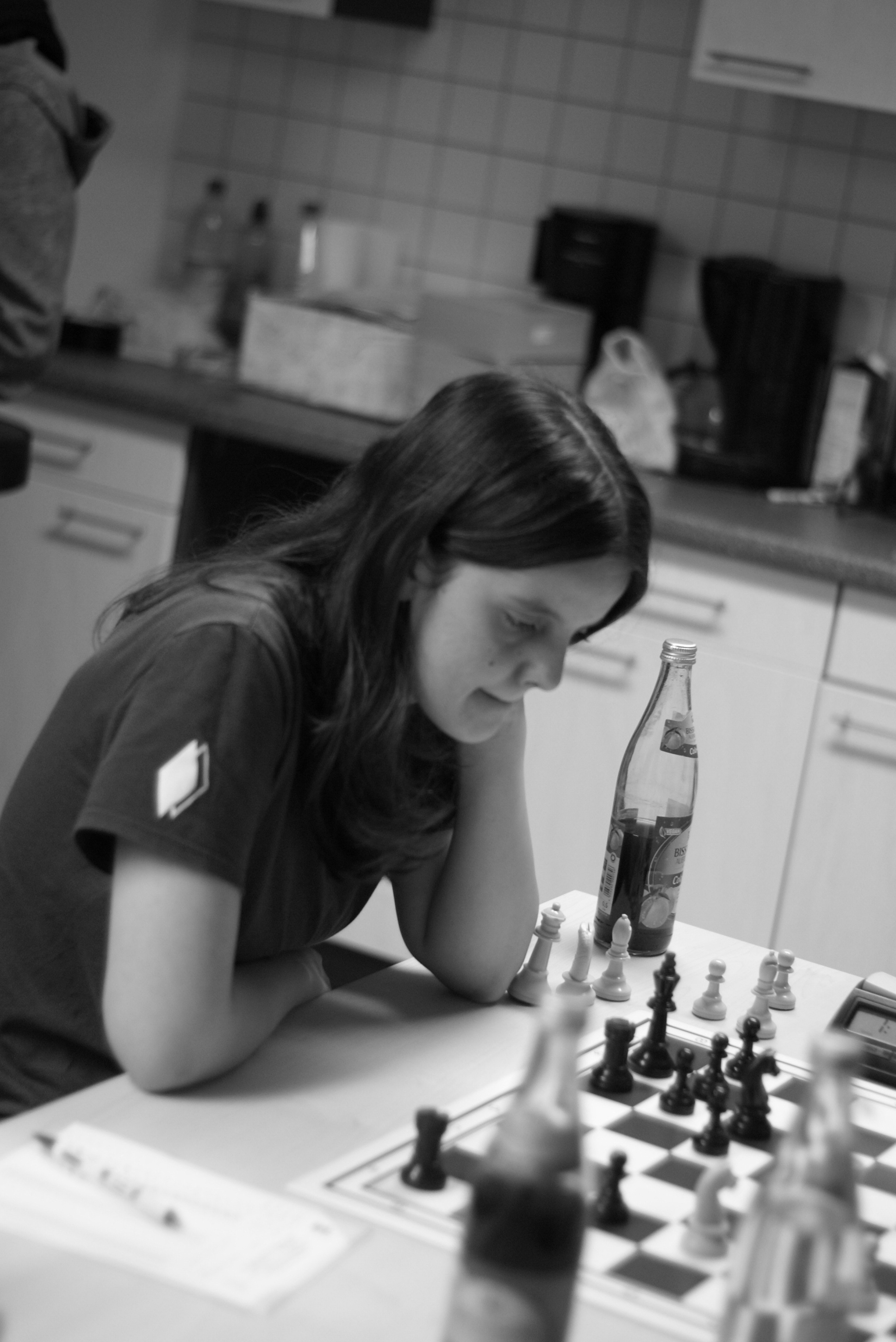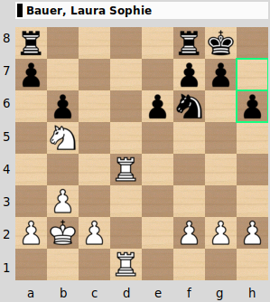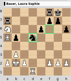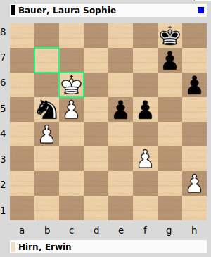 Nach dem Tausch der letzten Türme wäre manch einer angesichts der gegen den einsamen Springer heraneilenden verbundenen Freibauern, unterstützt vom König, nervös geworden , aber Laura behielt die Nerven und spielte das Ding konsequent runter, wie schon das ganze Turnier über. Dabei vermied sie auch die letzten Tretminen, die Erwin noch in Petto hatte.