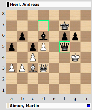 Martin Simon und Andi Hierl hatten noch die Chance mit 4,5 Punkten das Podest zu erreichen. Andi ließ zwar al Schwarzer früh einen gedeckten Freibauern auf d5 zu, was optisch nicht sehr ansprechend war, aber er hielt die Partie bis zum 40. Zug im Gleichgewicht, als er – ganz untypisch für seine bisherige Turnierleistung – mit einem fatalen Damentausch in ein unhaltbares Endspiel überleitete und verlor.