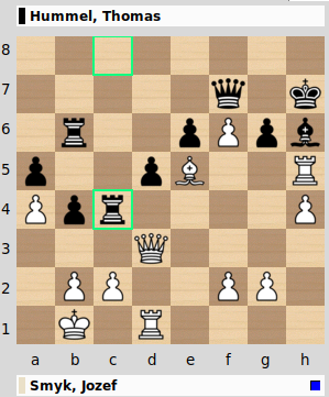 Auch Jezef Smyk und Thomas Hummel hatten noch Chancen auf den zweiten Platz. Das Spiel zog sich etwas zäh hin mit Raumvorteil für Jozef, aber dynamischem Gegenchancen für Thomas, dessen König in der Mitte geblieben war. Als Thomas ihn wieder zu Fuß zum Königsflügel beorderte erwies sich dies als verhängnisvolle Entscheidung.
