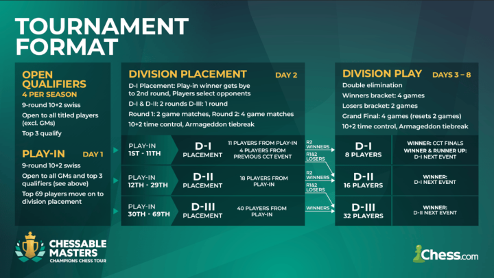Für die Division I sind Magnus Carlsen, Maxime Vachier-Lagrave und Vladimir Fedoseev aufgrund des Ergebnisses des letzten CCT-Turniers bereits vorqualifiziert. Um die restlichen fünf Plätze in Division I kämpfen die besten Elf des Play-In sowie die für das Division Placement vorqualifizierten Ian Nepomniachtchi, Anish Giri, Vladislav Artemiev und Sam Sevian. Dies geschieht in zwei Runden: der Sieger des Play-In hat in Runde eins Freilos, die Zweit- bis Sechstplatzierten wählen der Reihe nach ihre Gegner aus dem Pool der Siebt- bis Elftplatzierten. Die fünf Gewinner dieser Matches, der Sieger des Play-In sowie die vier Vorqualifizierten spielen in Runde zwei um ein Ticket in Division I. Für die Verlierer aus den beiden Runden geht es in Division II.