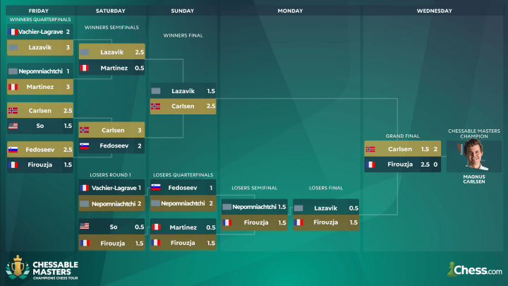 Vom 31. Januar – 07. Februar findet mit dem Chessable Masters das erste von vier Turnieren der Champions Chess Tour 2024 statt. Wie im Vorjahr wurde der Modus geändert: am ersten Tag findet das PlayIn (9 Runden CH-System, 10+2) statt, das offen für alle GMs ist, sowie drei Qualifizierte aus dem Open Qualifier (offen für alle anderen Titelträger). Die besten 69 Spieler des Play-In qualifizieren sich für das Division Placement am zweiten Turniertag. Anschließend folgt das sechstägige Division Play, wie gehabt in drei Divisionen mit Double Elimination und 4er-Matches bzw. 2-er-Matches im Verliererbaum.