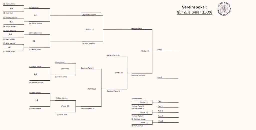Nachdem sich Niklas Rebler gegen Nikalas Derichev am Mittwoch schon mit 2-0 durchsetzen konnte, standen am Freitag die Paarungen Johannes Hierl gegen Noah Lehner, Vinzenz Schilay gegen Rudi Appl und Samuel Hierl gegen Martina Götz auf dem Plan. Ich konnte mich trotz einer eher durchwachsenen Leistung mit dem ein oder anderen Einsteller gegen Noah mit 2-0 durchsetzen. Vinzenz Schilay gelang ebenfalls ein 2-0 gegen Rudi. Martina setzte sich in der Zeitnotphase des Armageddons gegen Samuel durch.