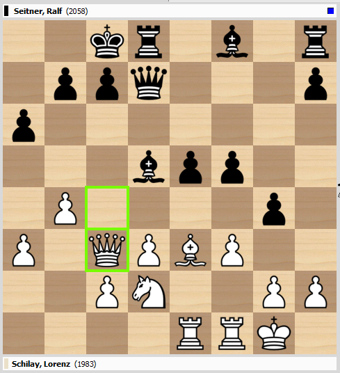 Unter Siegzwang opferte Lorenz in der zweiten Partie mit Schwarz bereits im 5. Zug einen Springer für den Zentralbauern e4. Ein an sich fragwürdiges Opfer aber matchtechnisch völlig korrekt, da nun Ralf höllisch aufpassen musste, in der hochkomplizierten Stellung nicht in ein Mattnetz zu laufen. Sein König hatte schon zu Fuß die Flucht von e1 nach b4 angetreten, wo ihn dann das Matt ereilt hätte, wäre nicht vorher Ralfs Zeit verbraucht gewesen. Ausgleich 1-1.