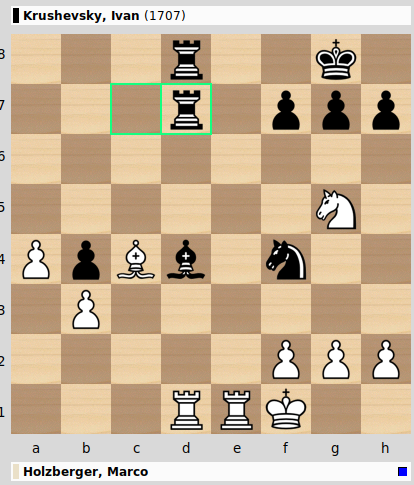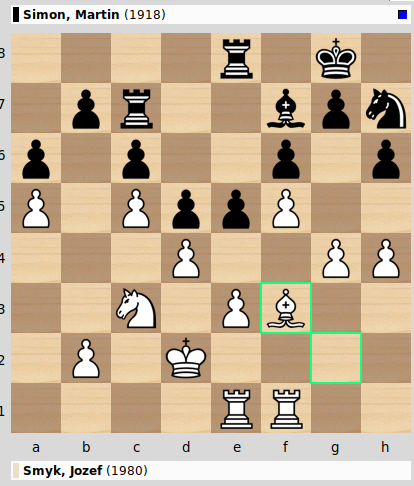 Die aktiven weißen Figuren und permanente Drohungen gegen f7 machten es Ivan schwer überhaupt einen Plan zu fassen und als er es versäumte, den aktiven weißfeldrigen Läufer abzutauschen, hatte er den Faden endgültig verloren. Er stellte noch zwei Bauern ein, und fesselte seine Figuren selbst, so dass Marco mit einer hübschen Schlusskombination den Sack zumachen konnte.