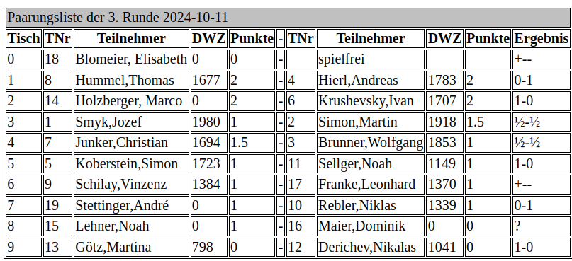 Die nächste Runde findet am 25.10. statt. Die Auslosung erfolgt, wenn die Partie Lehner – Maier nachgespielt ist.