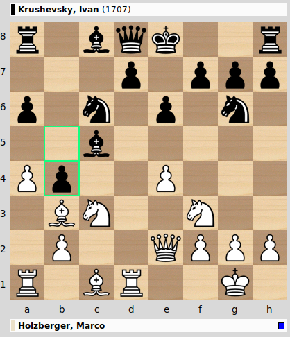 Im zweiten Spitzenduell bekam es Ivan Krushevsky als Schwarzer mit Überraschungsmann Marco Holzberger zu tun, der sich wieder einmal taktisch auf der Höhe zeigte. Marco versuchte als Weißer Ivan mit dem Morra-Gambit von Anfang an in einen „Straßenkampf“ zu verwickeln, was auch recht gut gelang.