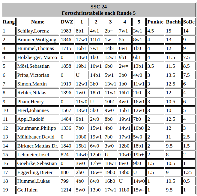 In der 3. Runde musste Lorenz allerdings ein erstes Remis gegen Wolfgang Brunner abgeben und lag damit vor der letzten Runde einen halben Punkt hinter Thomas Hummel, gegen den es in der Schlussrunde dann auch ging. Lorenz konnte sich dabei dank eines Qualitätsopfers einen starken Freibauern verschaffen, der es bis nach a7 schaffte und letztlich Lorenz den Sieg bescherte.