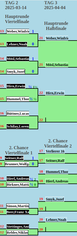 Damit rückt Ralf ins Viertelfinale 2 und Wolfgang darf um Platz 13 kämpfen.