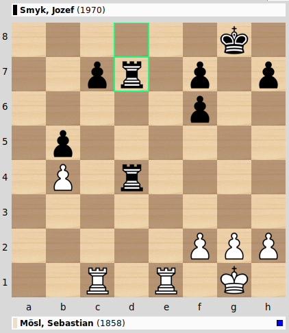 Jozef ließ sich hier nicht zweimal bitten, verdoppelte die Türme auf der zweiten Reihe und fraß sich durch die Bauernreihen, bis Sebi das Handtuch warf.