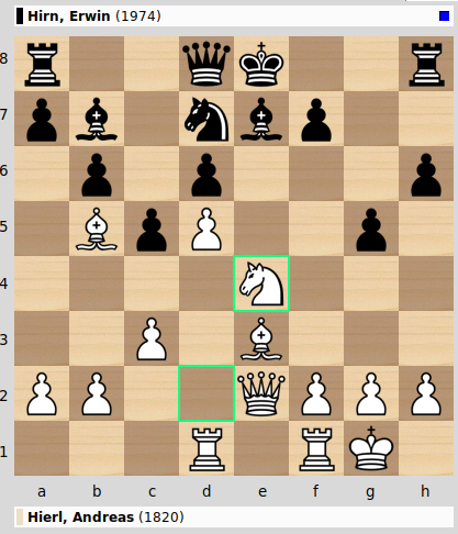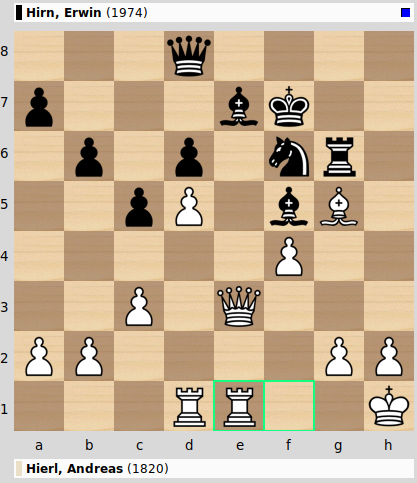 Mit Spannung erwartet wurde das Duell von Stadt- und Blitz-Stadtmeister Andi Hierl gegen Altmeister Erwin Hirn, der sich bisher nur Vorjahressieger Lorenz Schilay geschlagen geben musste. Andi kam ausgezeichnet aus der Eröffnung und war offenbar so sehr auf Krawall gebürstet, dass er auch vor einem Figurenopfer gegen Erwins unrochierten König nicht zurückschreckte.