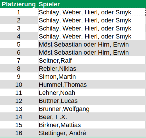 …trennt sich endlich die Sprue vom Weizen (meine Tastatur weigert sich angesichts bereits ausgeschiedener Namen wie Ralf Seitner, Martin Simon, Wolfgang Brunner Spreu richtig zu schreiben).Auf dem Weg ins Finale standen zwei Halbfinals im Verliererzweig an: