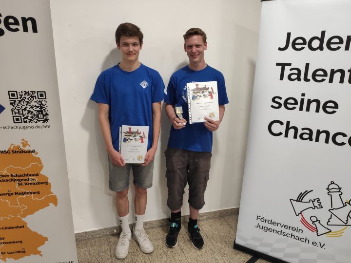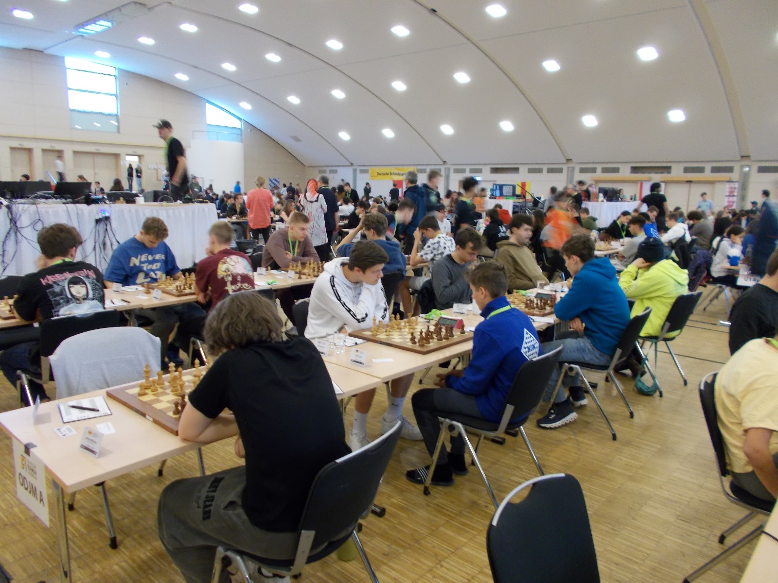 Wenn man in der letzten Runde im direkten Duell den Titel selbst in der Hand hat, dann hat man in diesem Turnier viel richtig gemacht. Es ist immer schwer das Feld in der U25C einzuschätzen, aber das Sebastian – der noch nie ein Turnier dieser Art gespielt hat und als Erfahrungsschatz an langen Partien einen Einsatz in der Kreisliga 3, einen in der U20 Bezirksliga B1 und die VM U1800 vorzuweisen hat – einiges zuzutrauen sein würde war klar. In jeder Partie suchte er die Initiative, setzte die Gegnerschaft unter Druck und gewann im Königangriff. Ein Wermutstropfen bleibt – die Riesenchance auf den Titel mit dem verpassten Figurengewinn. Aber Platz vier mit starken 7/9 sind ein hervorragendes Ergebnis und damit stand er als vierter Neumarkter bei der Siegerehrung auf der großen Bühne. Dort war auch Laura als Fünfte anzutreffen und das nach 2020 und 2022 schon zum dritten Mal. Sie hatte sich nach sieben Runden eine hervorragende Ausgangsposition im Kampf um die Podestplätze erspielt, ehe sie bereits gesundheitlich angeschlagen hinten raus nicht mehr bei 100% war. Andreas hatte vor zwei Jahren noch die U25C mitgespielt, diesmal trat er erstmals in der U25A an. So richtig kam er nicht in das Turnier, meist geriet er kurz vor der ersten Zeitkontrolle in Zeitnot unter Druck und stand trotz langen Kampfes am Ende mit leeren Händen da. Aber in diesem Turnier ging es ja hauptsächlich darum auf höherem Niveau Erfahrungen zu sammeln, die ihm bei künftigen Auftritten zu Gute kommen werden.