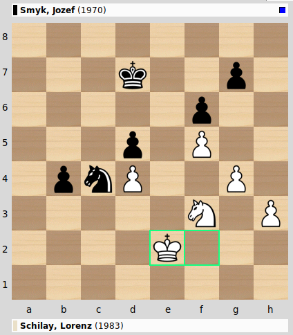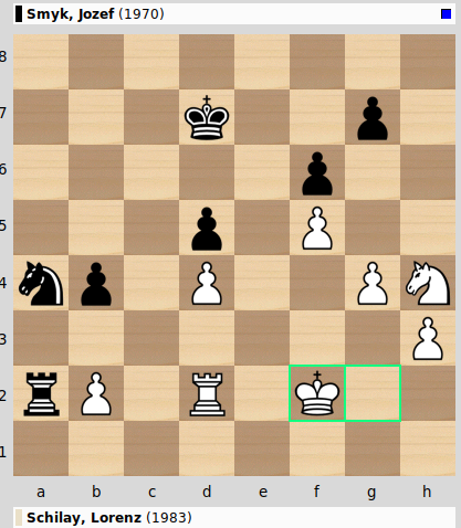 In der Folge wurden viele Figuren getauscht und es entstand ein Turm und Springerendspiel. Jozef konnte seinem Turm die offene a-Linie sichern und gefährlich in Lorenz Lager eindringen. In beginnender Zeitnot fand Jozef allerdings nicht den entscheidenden Schlag, der ihm den Sieg hätte bringen können:
