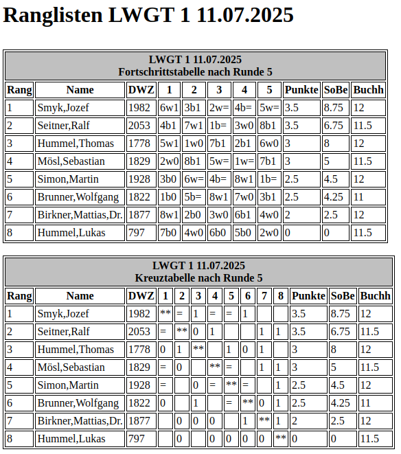 Zum ersten Scnellschachturnier der 3-er Serie kamen am Freitag 8 Spieler (zeitgleich war – wie immer – das Jugendzeltlager). Vor der letzten Runde lag ziemlich sensationell Thomas Hummel Dank besserer Feinwertung an der Spitze vor Jozef Smyk. Jedoch musste sich Thomas am Ende Wolfgang geschlagen geben, so dass Jozef ein Remis gegen Martin zum Turniersieg reichte, punktgleich mit Ralf Seitner).