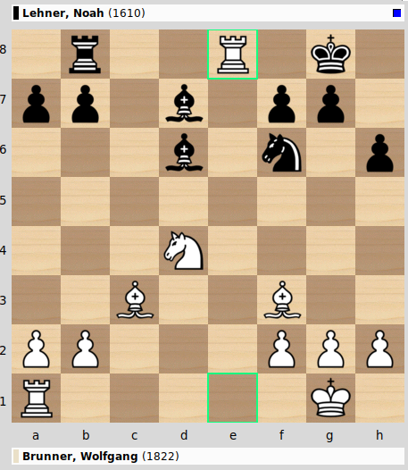 Schwarz kann den Turm mit drei Figuren wiedernehmen: 21…Lxe1? ist zweifelhaft, weil nach 22.Sf5 der Ld6 angegriffen ist und Sxh6 droht (wegen des Angriffs auf den Sf6). Nach 21…Sxe8 macht der Springer keinen besonders guten Eindruck und auch die Läufer stehen eher passiv rum. 21…Txe8 gibt mit 22.Lxb7 einen Bauern, was nicht unbedingt ein Problem sein muss, wenn man die Chancen im Endspiel mit Minusbauer richtig einschätzt. Noah entschied sich für das Nehmen mit dem Springer und verlor nachher doch noch einen Bauern: