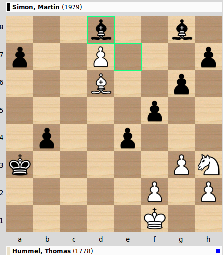 15 Züge später ist das weiße Rösserl noch kein bisschen weiter gekommen und für die zwei Bauern hat Thomas immerhin seinen Bauern nach d7 vorgestoßen,was aber nur ein schwacher Trost ist. Dreizehn Züge später gab Thomas auf.