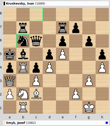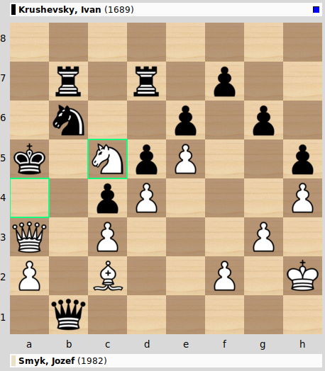 Das Schlagen auf a4 oder b5 liegt in der Luft, will aber genau berechnet sein. Jozef blieb hier cool und zog den ruhigen Zug Kh2! mit der Idee, dass nach Txb5 Dxb5 Sxa4 der Turm auf b1 nicht mit Schach geschlagen werden kann und der Angriff ungehindert weiterrollen kann. So kam es dann auch und in der Schlussstellung ist für Schwarz nichts mehr zu retten: