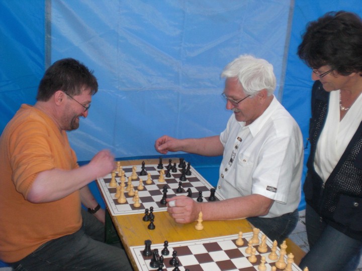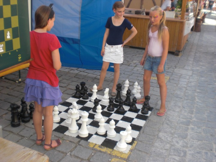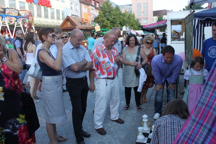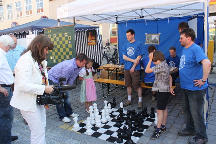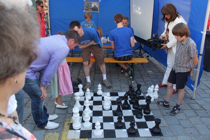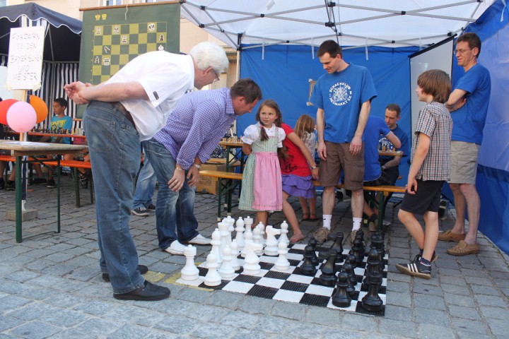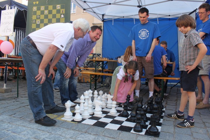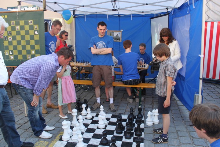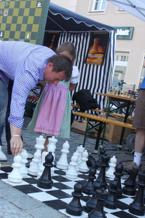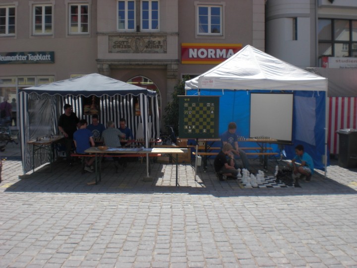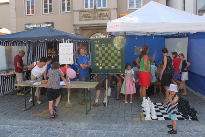 Am Freitag um 19h startete das Neumarkter Altstadtfest pünktlich zur herauskommenden Sonne und auch wir waren nach den erfolgreichen Auftritten 2007-10 wieder mit von der Partie, diesmal mit doppelter Standgröße. Traditionell gab es einige Mattaufgaben zu lösen und Infomaterial über unseren Verein. Außerdem standen sechs Bretter für Partien zur Verfügung, sei es gegen Mitglieder des Vereins oder der Besucher untereinander. Diese waren auch sogleich durchweg gut frequentiert und insbesondere unser Gartenschach war ein Besuchermagnet sowohl zum selber Spielen als auch zum interessierten Kiebitzen. Bis kurz nach Mitternacht fanden sich Spielpartner bei immer noch angenehmen Temperaturen.