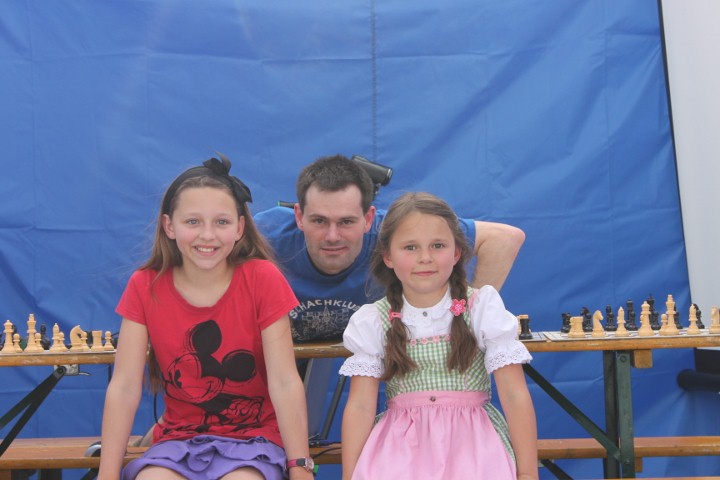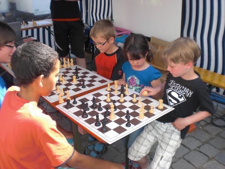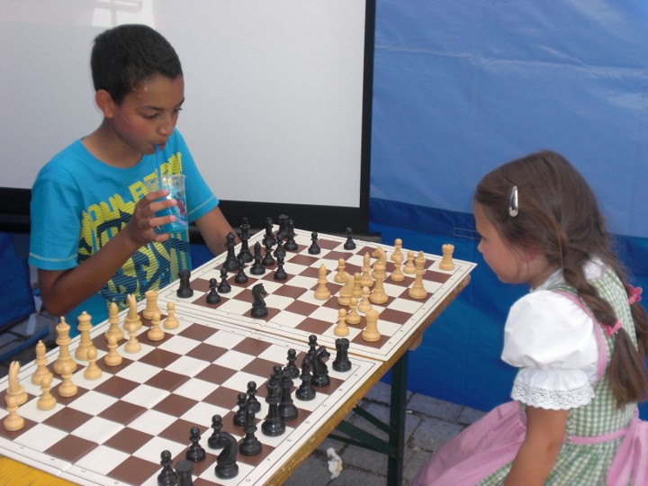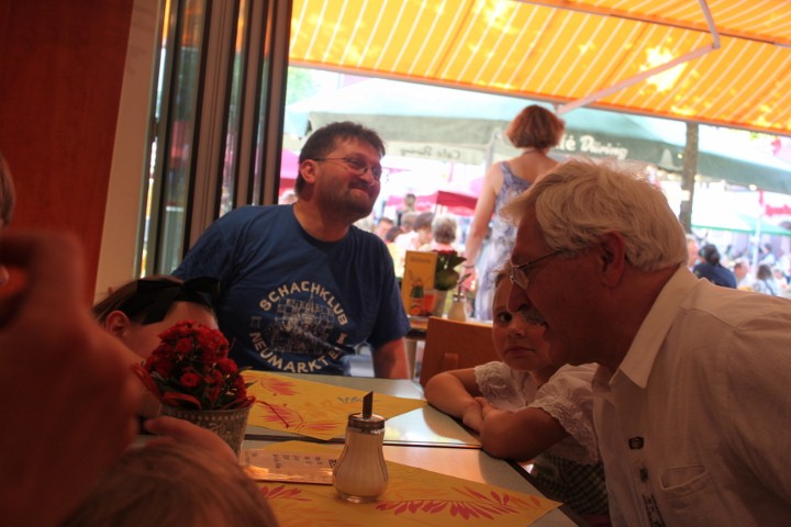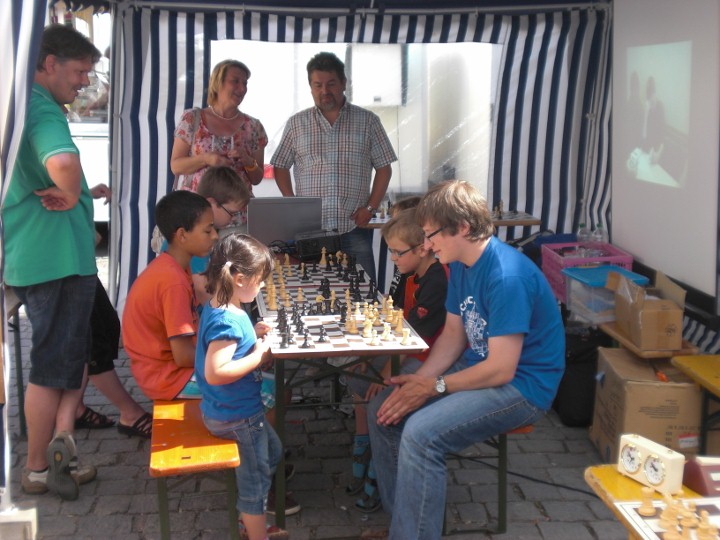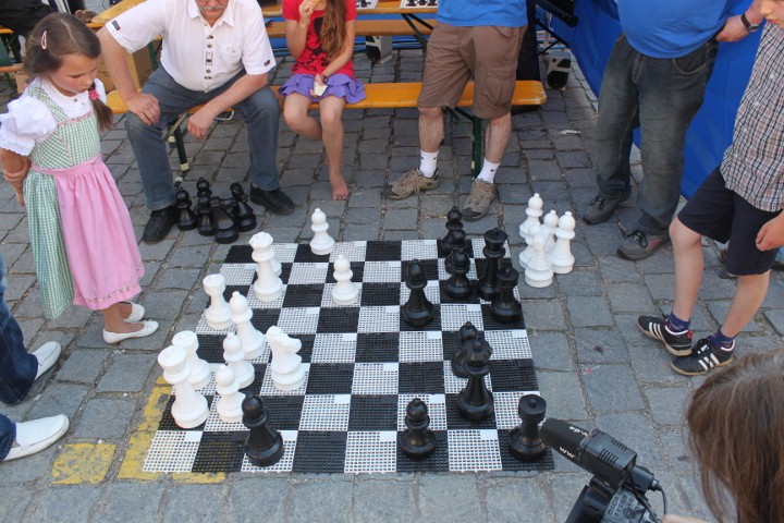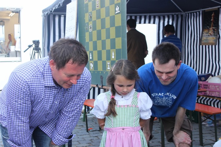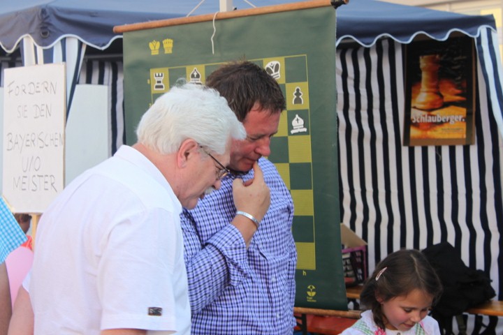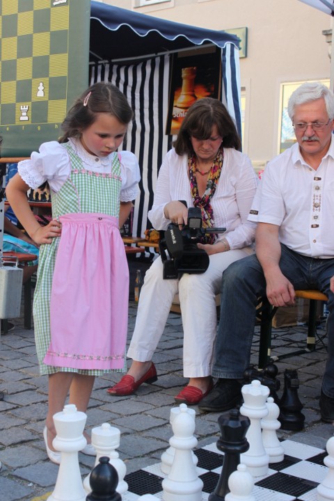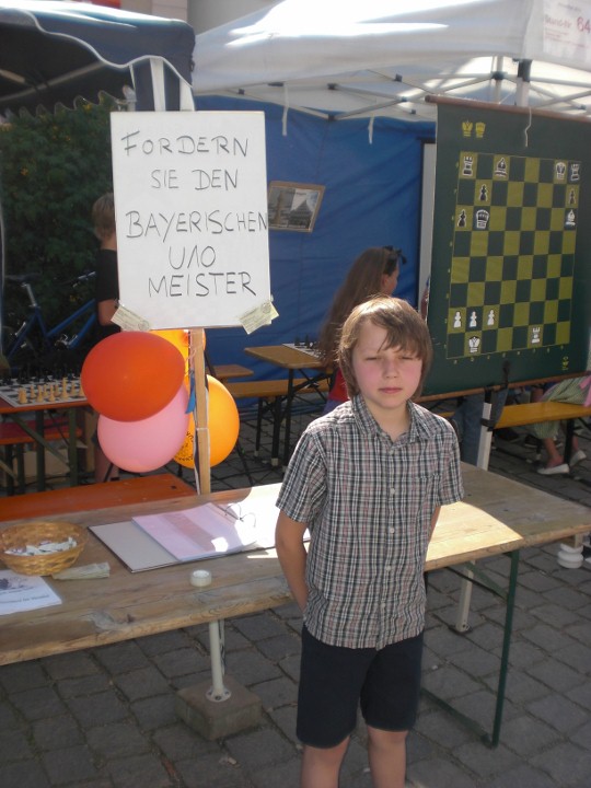 Am nächsten Tag ging es um 14h weiter und diesmal hatte es die Sonne zu gut mit dem Altstadfest gemeint, denn bei über 30 Grad im Schatten ließen die Besuchermassen noch auf sich warten. Dennoch fanden sich immer wieder Interessenten, die u.a. den Bayerischen U10 Meister Lorenz Schilay zu einer Partie herausfordern konnten.