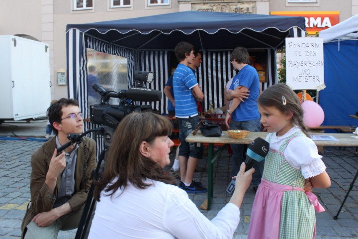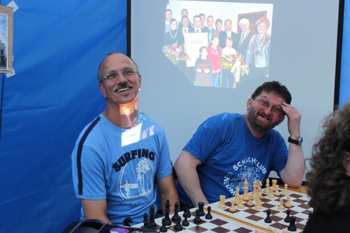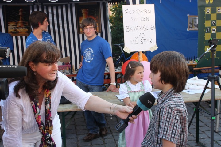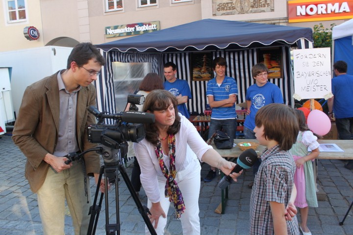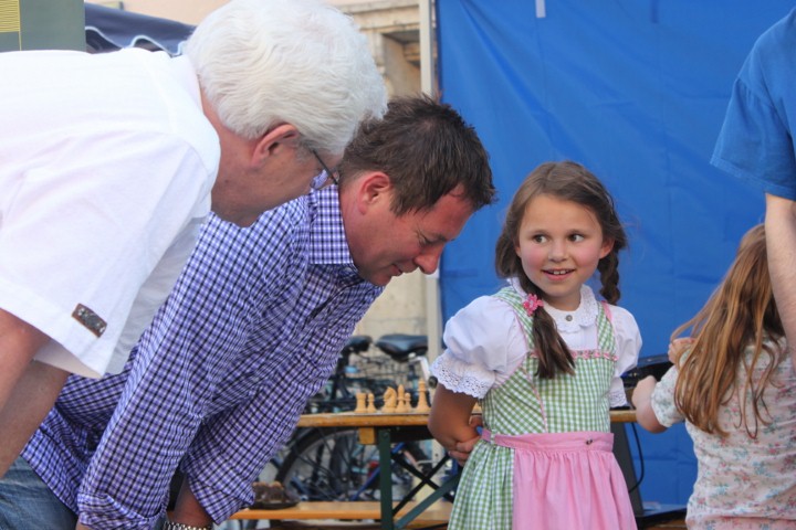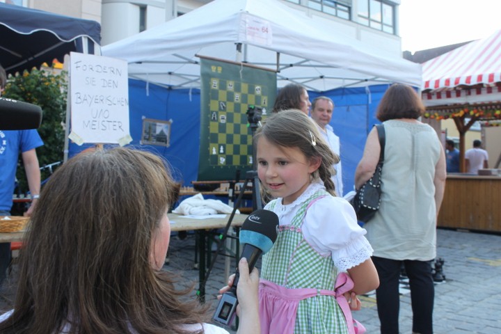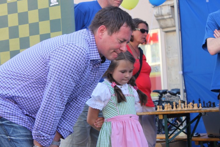 Um 18h stand dann das Highlight aus unserer Sicht an. Oberbürgermeister Thomas Thumann und 2.Bürgermeister Franz Düring statteten unserem Stand einen offiziellen Besuch ab und forderten Lorenz zu einer Partie heraus. Da die beiden Amtsträger nicht über die notwendige Spielpraxis verfügen bekamen sie mit Maria Schilay eine kompetente Beraterin zur Seite gestellt. Vor einer großen Zuschauerschar entwickelte sich eine spannende Partie mit unterschiedlich rochierten Königen, wobei der Oberbürgermeister wohlweislich den Ratschlägen seiner jungen Assistentin folgte. So bewahrte Maria ihre Mitstreiter vor einem drohenden Matt, dass dem 2.Bürgermeister doch glatt entgangen war. Denn Lorenz nutzte den auf h3 postierten Bauern zu einem Königsangriff mittels g5-g4 und öffnete somit die g-Linie. Doch das gegnerische Trio verteidigte sich ideenreich und selbst nach einem Bauernverlust wurde dieser umgehend zurückgewonnen. Allerdings übersah Maria eine drohende Überlastung, die doch noch eine Qualität für einen Bauern kostete. Nach über 30minütigem Kampf hatte Lorenz zwar eine vorteilhafte Stellung erreicht, der Sieg war aber noch nicht greifbar. Dies nutzte Bürgermeister Düring zu Verhandlungen und bot an, alle Akteure zu Eis und Kuchen in sein Café einzuladen. Dieses Angebot war dann doch zu verlockend und man einigte sich auf ein Unentschieden. Nachdem unsere beiden Nachwuchsstars noch dem Sender IN-TV ein Interview gegeben hatten, ließen sie sich ihr verdientes Eis schmecken.