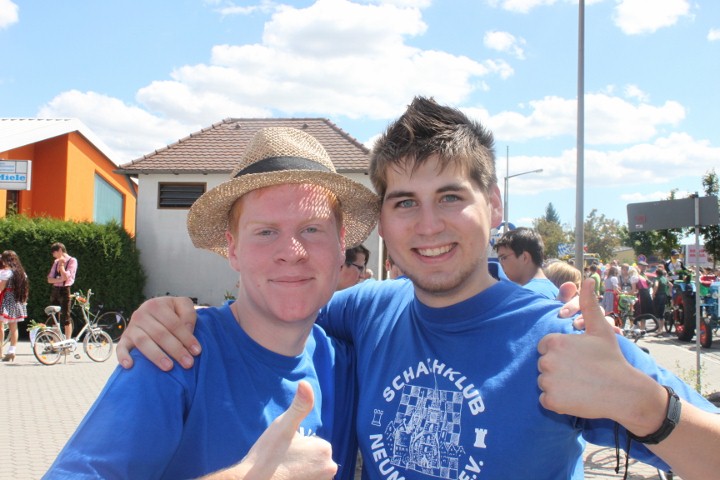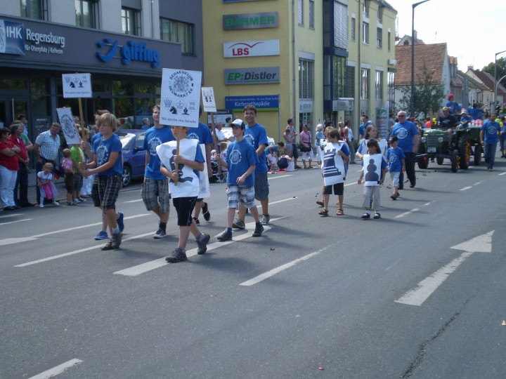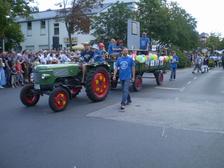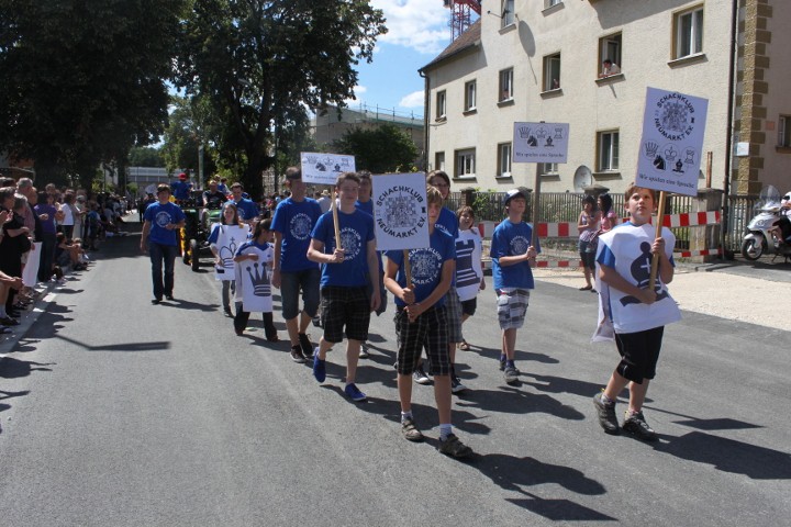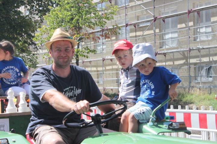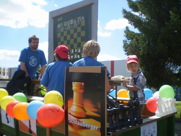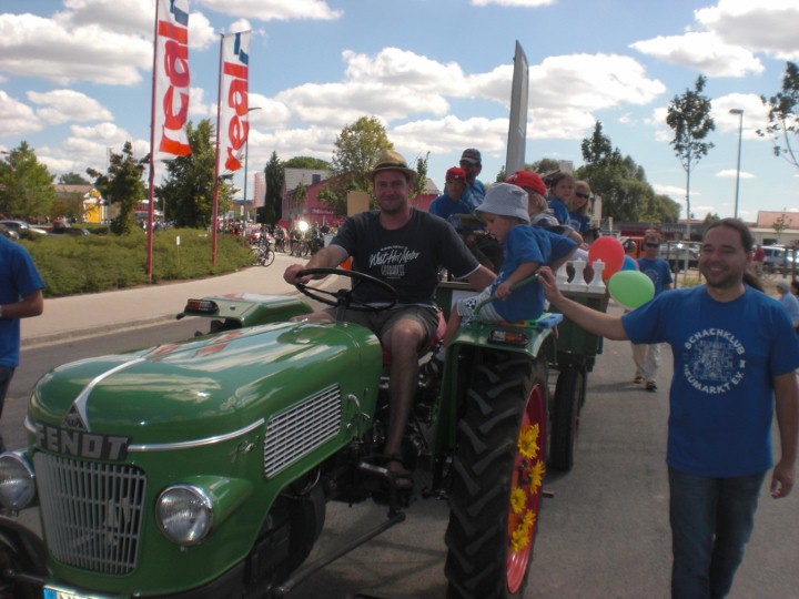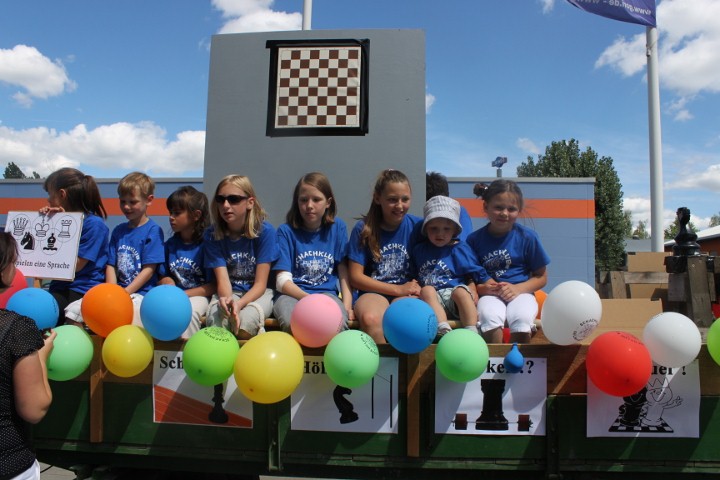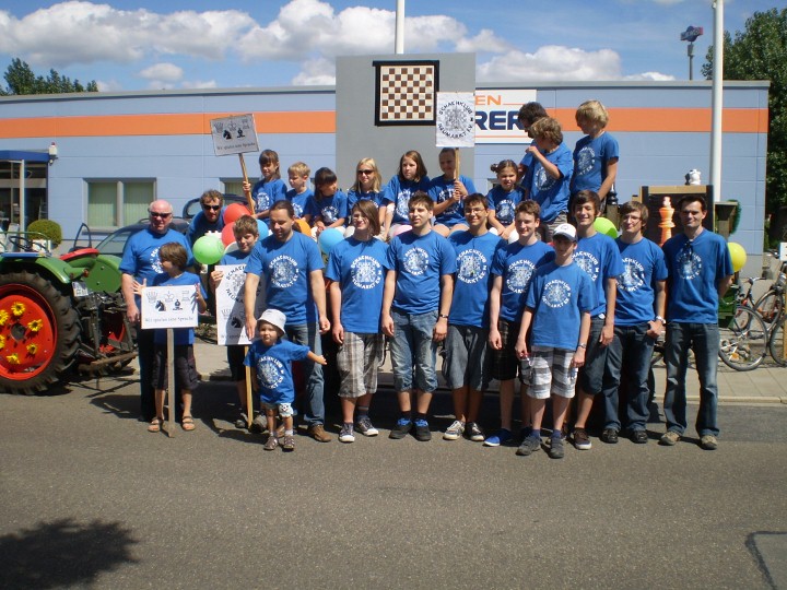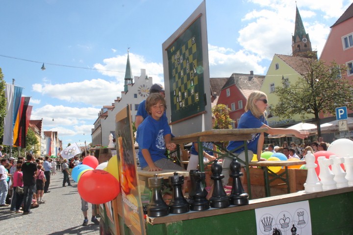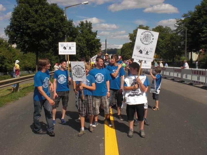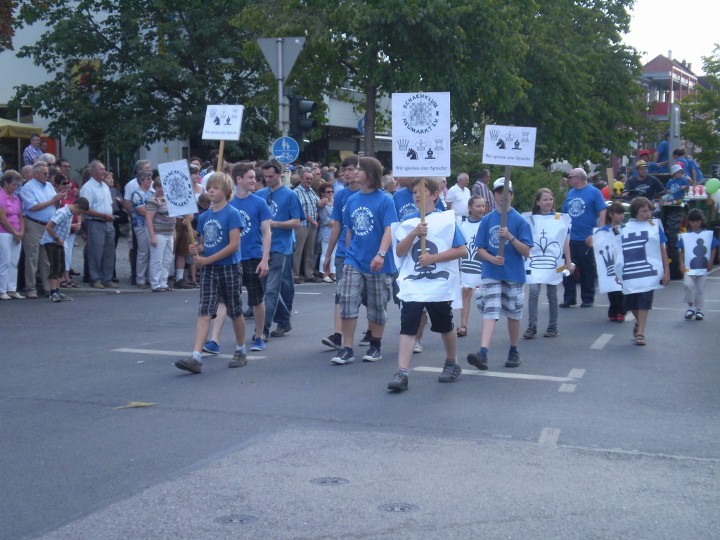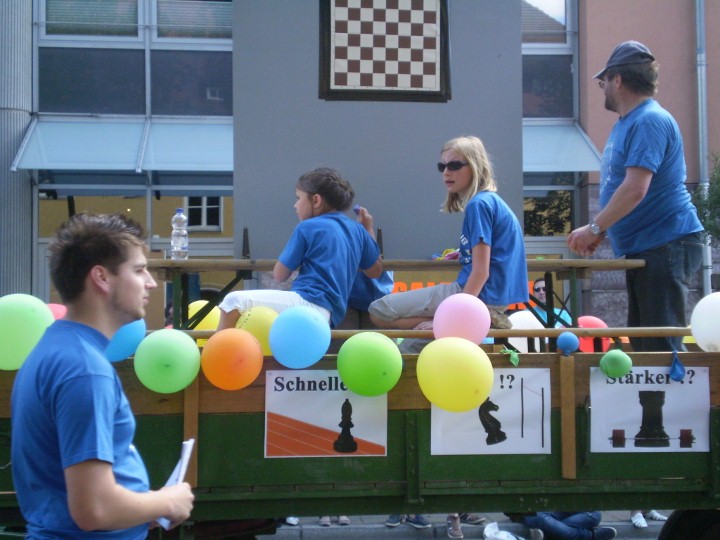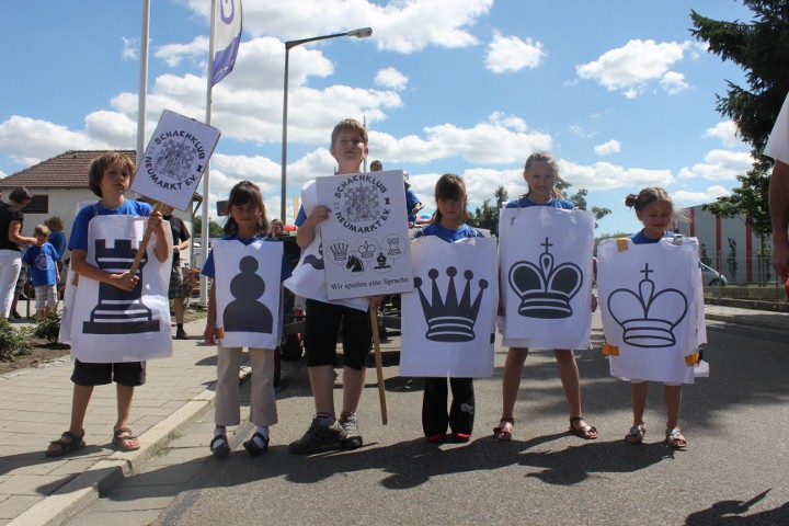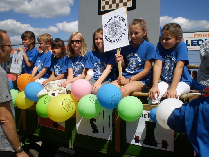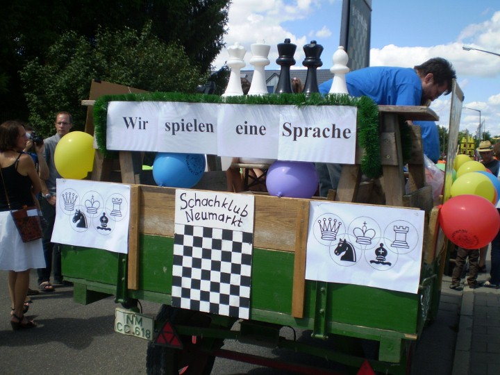 Auch in diesem Jahr nahmen wir wieder am traditionellen Festumzug des Neumarkter Jura-Volksfests teil. Dabei hatten wir erstmals seit 2008 wieder einen Festwagen, den wir mit zahlreichen Schachmotiven geschmückt hatten. Da der Festzug unter dem Motto „Neumarkt im Zeichen der olympischen Idee“ stattfand, wählten wir das Motto der Schacholympiade 2008 in Dresden „Wir spielen eine Sprache“ für unseren Beitrag.
